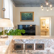 Sintesi perfetta di precisione tecnologica e artigianalità, disponibile in diversi materiali e finiture di prestigio, dalla pietra, al metallo, al vetro e capace di integrarsi perfettamente in ogni ambiente, creando ogni volta un’anima originale, in questo magico contesto, Eikon Exé è stata scelta, nella declinazione tradizionale, con finitura in bronzo scuro spazzolato e comandi grigio antracite. Profili sottili, angoli squadrati per una placca che è pura essenza di forma e materia. I dispositivi installati sono perfettamente visibili e disposti in forma ordinata sulle eleganti testate dei letti in tessuto imbottito, sulle boiserie dei bagni, e in tutti gli spazi comuni. Una geometria classica e definita. In un’ala di servizio, al piano inferiore, rispetto al salone nobile, con accesso diretto verso il giardino esterno, si trova una grande cucina in acciaio inox, attrezzata per gli eventi. Tra il candore delle pareti intonacate e le sfumature metalliche degli arredi si armonizza il minimalismo della serie Linea, nella versione bianca con comandi assiali neri; comandi dall’azionamento preciso, grazie ad una tecnologia brevettata, capaci di evidenziare ancora di più la perfetta planarità tra i tasti e la superficie. Così, dove la forza del mare incontra la solidità della pietra, la tecnologia Vimar si integra con l’architettura neomedievale.